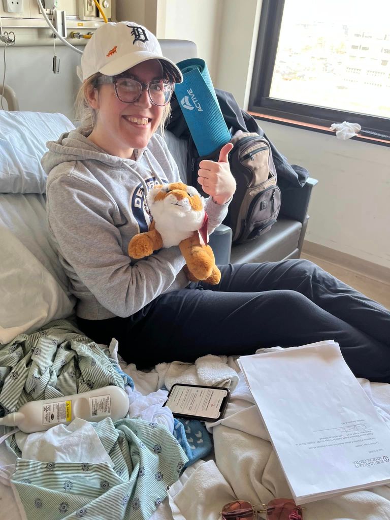 Shan with a stuffed tiger a friend sent her while she was in the hospital in April. Thank goodness she had the Tigers to distract her while she was there!
