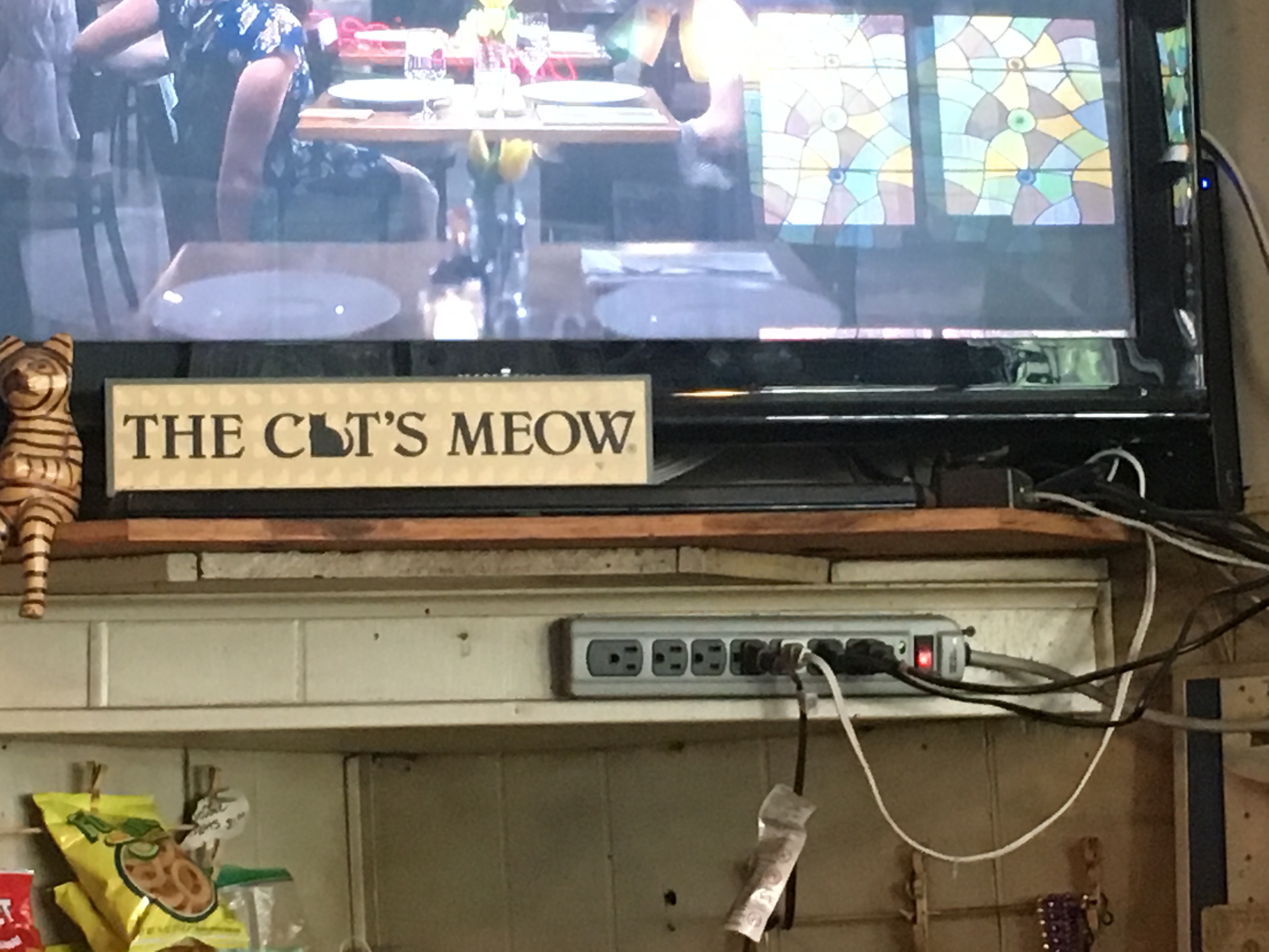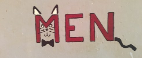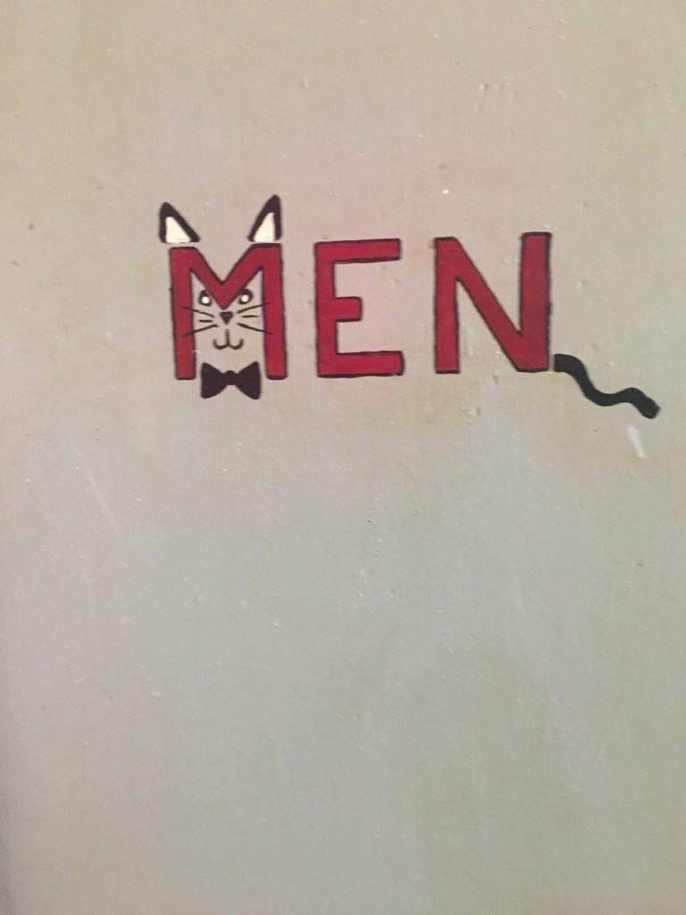The cat theme was subtle and varied in levels of taste. The restroom doors were A+. I remember most of the famous cats being represented in some way or another. Garfield, Felix and the likes. I took some pictures. I’d have probably taken more if not for the series of events that happened next.
